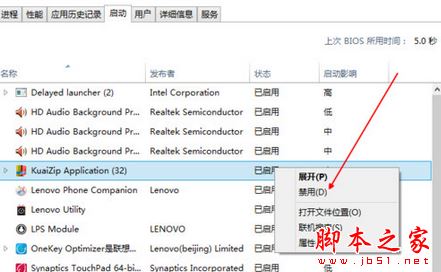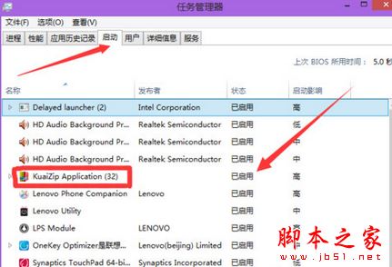 這時候我們在選項欄找到啟動按鈕,這里把電腦所有的啟動項都列出來了,找到“快壓”(KuaiZip Application)的啟動項,發現它是“已啟用”的。