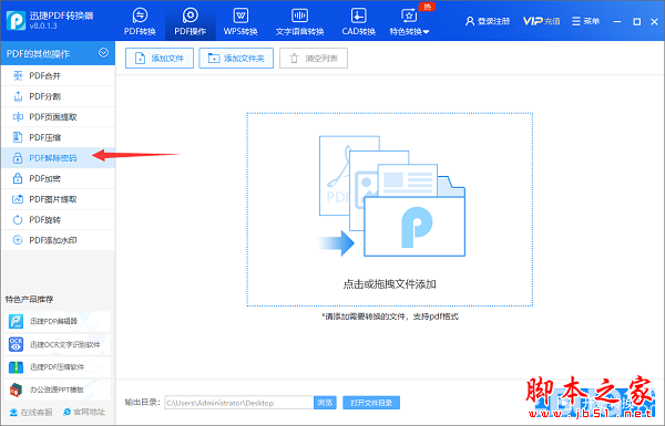 打開迅捷PDF轉換器,進入界面,在左側點擊【PDF的其他操作】,選擇【PDF解除密碼】功能,