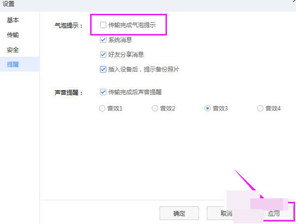 7、然后點擊【應(yīng)用】,設(shè)置就會馬上生效。接下來,傳輸完成就不會出現(xiàn)氣泡提示了~