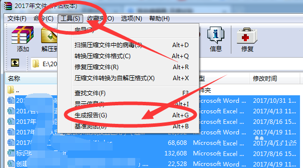 5、我們再點擊【WinRAR】軟件的【工具】菜單,在下拉菜單中選擇【生成報告】,如下圖。
