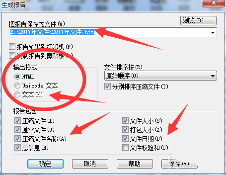 6、在【生成報告】對話框中,根據自己的實際需要進行選擇。一是生成的文件保存的位置,二是生成的文件格式,三是生成的文件內容。這些都可以根據自己的實際需要進行選擇。選擇好之后,點擊正文的【確定】即可。