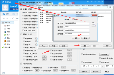 點擊“禁止打開的程序”,然后點擊“添加”,然后拖動放大鏡圖標到網盤的客戶端上,程序就會自動讀取到網盤的相關特征,然后點擊“確定”,并點擊“保存”,即可成功禁止了百度網盤的客戶端,此時如果打開了百度網盤客戶端,則程序就實時將其關閉。如下圖所示: