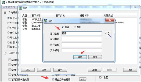 方法與禁止客戶端相同,點擊“禁止打開的程序”,然后點擊“添加”,然后在窗口哪里輸入“打開”,點擊“確定”,并點擊“保存”即可。如下圖所示: