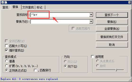 選擇替換,把查找模式設(shè)置為正則表達(dá)式,在查找框中輸入 ^/s+ ,替換框留空,點(diǎn)“全部替換”,即可(先全選)。
