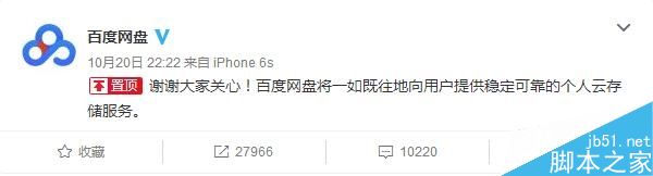 對此百度網盤在官方微博回應:謝謝大家關心!百度網盤將一如既往地向用戶提供穩定可靠的個人云存儲服務。