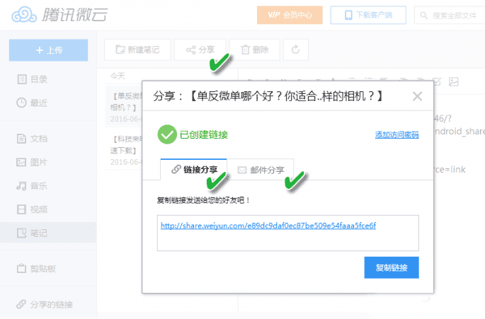 與此同時,點擊“分享”按鈕,還可以生成筆記文章的鏈接地址,復制地址后可通過任意通信工具發送給朋友共享。也可以點擊“郵件分享”標簽,輸入郵件標題和收件人,馬上以郵件形式與好友共享文章(圖6)。