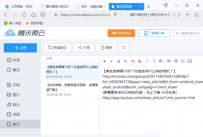 在WEB版的微云窗口或PC客戶端微云窗口中,點擊左側的“筆記”按鈕,隨時都可以像寫Word文章那樣寫下自己的圖文筆記(圖5)。這一筆記馬上可以同步到自己的微云空間。在另一種設備或另一個平臺的微云客戶端中,打開自己的微云筆記,就能閱讀筆記或繼續書寫沒有完成的筆記。
