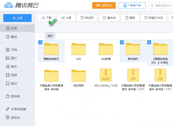 在微云網盤窗口中,把鼠標移動到需要下載的文件夾或文件上,左上角會出現選擇框,逐一勾選要下載的文件或文件夾,然后點擊“下載”按鈕,微云網盤即可自動打包這些文件,進行一次性下載(圖8)。