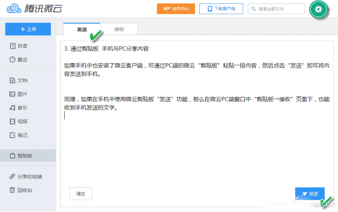 同理,如果在手機中使用微云剪貼板“發送”,那么在PC端微云窗口的“剪貼板→接收”頁面下,也能收到手機發送的文字。