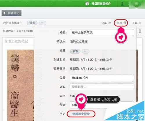 2、在Windows和Mac電腦客戶端,或登錄印象筆記網頁版,打開筆記,點擊筆記頁面右上角按鈕“i”信息— 查看筆記歷史版。