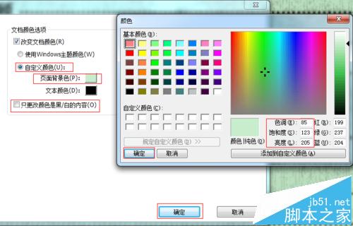 3、選擇 '自定義顏色'->'頁面背景顏色'->修改色調 85,飽和度 123, 亮度205 ->->不勾選'只更改顏色是黑白的內容'選項->確定保存