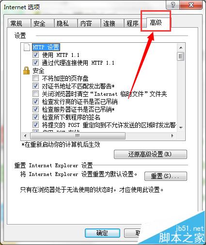 4、在【高級(jí)】界面中點(diǎn)擊“將Internet Explorer設(shè)置重置為默認(rèn)設(shè)置”右邊的【重置】選項(xiàng)按鈕,如圖所示