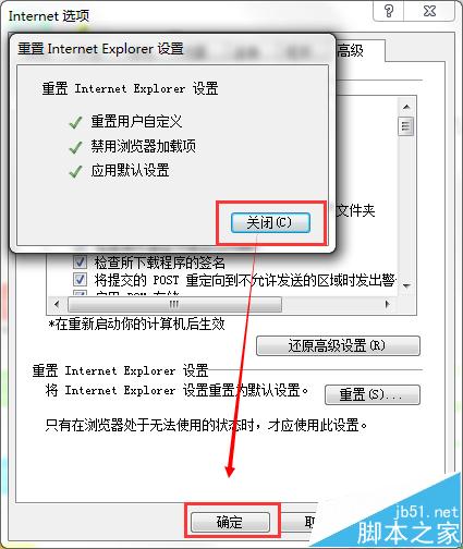 6、重置完成后點(diǎn)擊【關(guān)閉】按鈕關(guān)閉重置對(duì)話框,點(diǎn)擊【確定】退出【Internet選項(xiàng)】對(duì)話框
