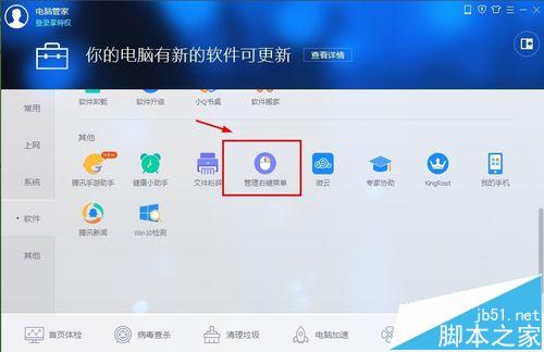 3、在軟件這一項里面找到管理右鍵菜單這一項,如下圖位置所示。可能位置跟管家版本有點關系。