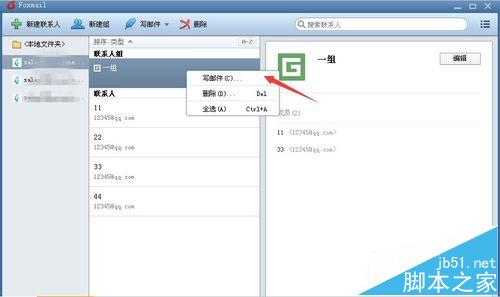 5、聯系人組建好之后,選擇組,鼠標右鍵點擊,在彈出來的選項卡中選擇“寫郵件”選項。此時會彈出寫新郵件界面,且收件人欄中已經自動加載了所有組成員的郵箱地址。