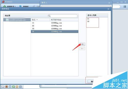 3、在“添加成員”彈出來的對話框中,可以看到郵箱所有的聯系人信息,選中想要發送的聯系人,通過朝右箭頭移動到參與人列表中。移動完成后點擊“確定”按鈕。