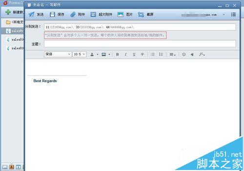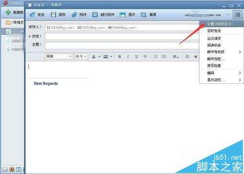 6、在寫新郵件界面郵編下拉框選項中選擇“設置分別發送”,此時可看到收件欄會變為分別發送,且下面會加載分別發送的注解,郵件將會對多個人一對一的發送。編輯好郵件后,直接點擊發送按鈕即可成功將郵件以一對一的形式發送給每個聯系人了。