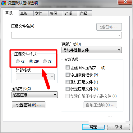 在壓縮文件格式中,有三種選擇,選擇其中的一個(gè)并點(diǎn)擊下方的“確定”按鈕完成保存。