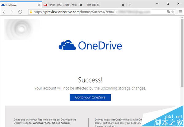 點擊之后,首先是微軟的“感謝”內容,點擊頁面下方的“保留你的免費空間”即可跳轉到下個頁面。確認OneDrive連接內容后即可成功保留原有空間。