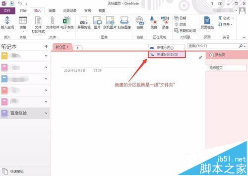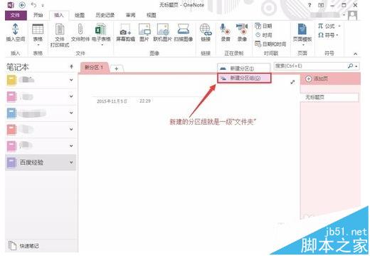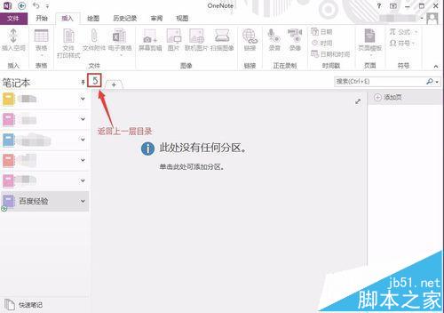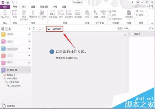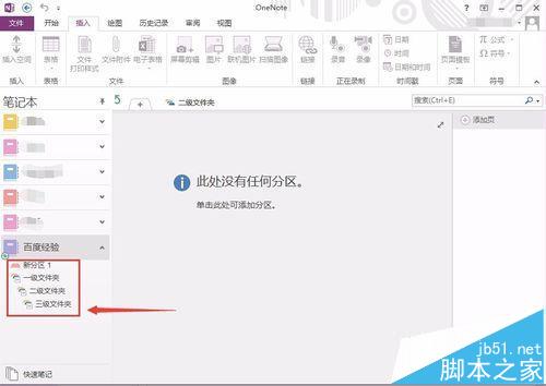8、可以看到,在左側(cè)的“百度經(jīng)驗(yàn)”筆記本下層次圖中清晰的顯示出了三層分區(qū)的隸屬關(guān)系。點(diǎn)擊可以方便的切換到想瀏覽的分區(qū)。