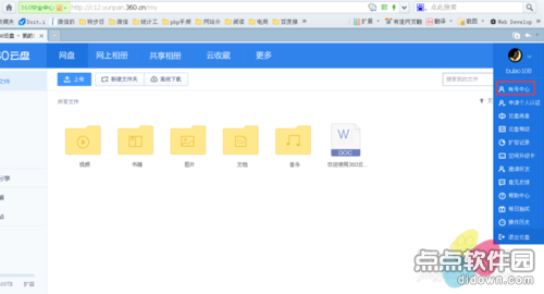 輸入用戶名,密碼后登陸360云盤(pán)。找到右上角頭像昵稱的地方,鼠標(biāo)移上去會(huì)彈出一個(gè)下拉框,選擇第一個(gè),賬號(hào)中心