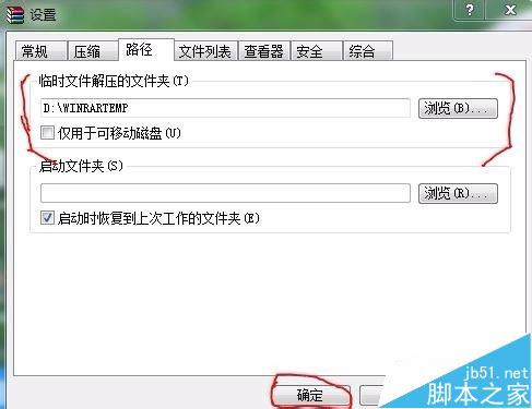 5、修改臨時文件解壓的文件夾路徑,可以點擊右側的瀏覽自定義要存放臨時文件的地方,然后去掉"僅用于可移動磁盤",完畢后點擊確定保存設置。