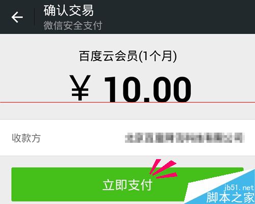 6、掃一掃完成后跳轉為付款確認頁面,請在付款前確認一下金額是否與網頁一致,確認開通的時間與付款金額相符,點擊[立即付款],輸入[支付密碼]就能完成支付