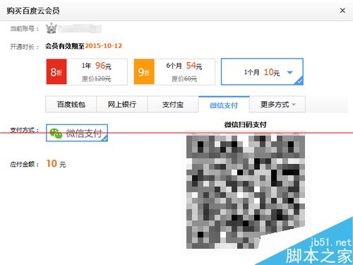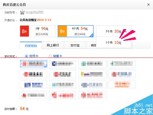 3、開通會員默認的付款方式為百度錢包,會員開通的周期為6個月時間,可更改,第一步,我更改百度云會員的開通時長,點擊右邊的選項可以更改最短一個月