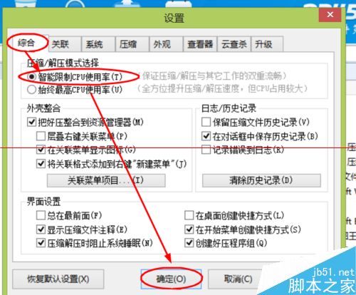 3、在【設置】界面下,點擊選擇【綜合】--【智能限制CPU使用率】--【確定】選項完成設置。(如圖所示)