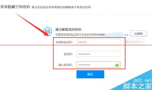 5、然后輸入綁定的郵箱收到的驗證碼,并且輸入兩次一致的密碼,再單擊【確定】按鈕。如下圖所示。