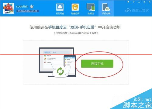 4、配置百度云電腦端軟件。請登錄到百度云,切換到手機忘帶,點擊:連接手機。