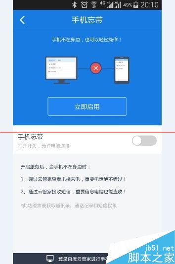 3、配置百度云手機端軟件。請登錄到百度云,并點擊:發現 》手機忘帶。點擊開啟。