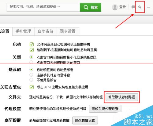 4、修改保存路徑:一般安裝豌豆莢的時候,他會默認保存到C盤,如果你想改變保存位置,那么可以在主界面的右上角先點擊【 工具 】然后再點擊【 修改默認存儲路徑 】