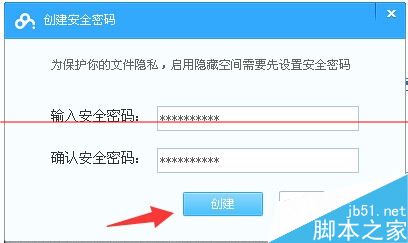 5、接著需要?jiǎng)?chuàng)建隱藏空間的安全密碼,需要連續(xù)輸入兩次密碼,然后點(diǎn)擊“創(chuàng)建”按鈕。(如下圖)