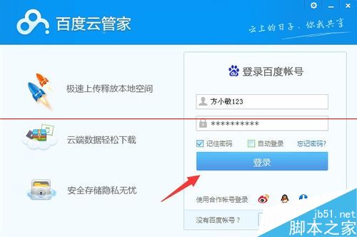 2、打開百度云管家之后,來到百度賬號(hào)的登陸窗口,輸入自己的百度賬號(hào)和登陸密碼,然后點(diǎn)擊“登陸”。(如下圖)