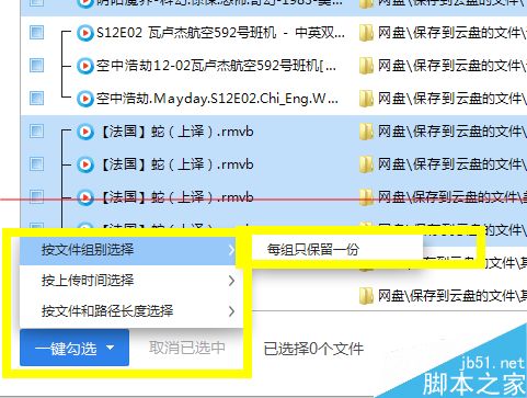 4、掃描完畢后彈出如下對話框,點擊一鍵勾選選擇勾選方式,有多種勾選方式供選擇,這里我選“按文件組別選擇”里的“每組只保留一份”,然后點擊右下角的刪除鍵即可。