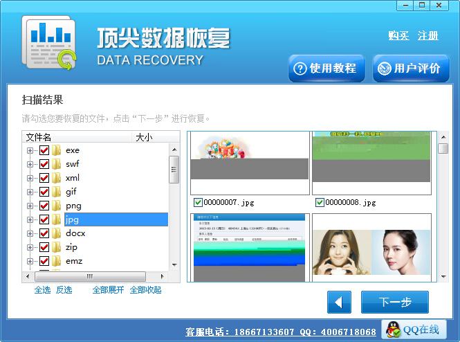 第四步:掃描完查找掃描結果,勾選需要恢復的文件,然后點擊下一步。用戶可以瀏覽掃描出來的文件,根據自己的需要有選擇的恢復,提高恢復效率。