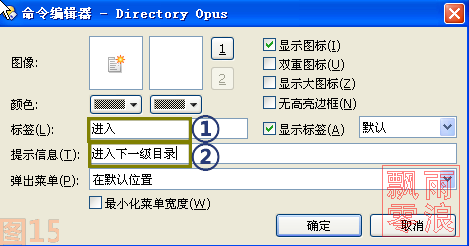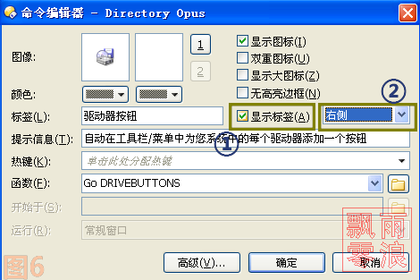 6. 如圖6,在彈出的“命令編輯器”中勾選“顯示標簽”(①),并在右邊的下拉框中選擇“右側”(②),點擊確定,再點擊“自定義”對話框的確定退出。