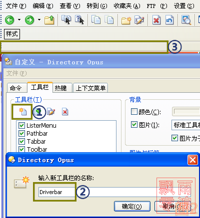 2. 如圖2,點擊“新建”按鈕(①),在輸入框中輸入驅動器欄的名字(②),比如“Driver”,確定。此時你會發現在列表窗上方出現了一個新的空白Toolbar(③)。