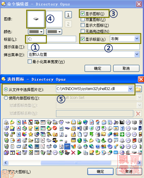 2. 右鍵點擊這個新建的按鈕,選擇“編輯”,如圖9,在彈出的“命令編輯器”中修改標簽為“C:”(①),右側的“顯示標簽”中選擇“右側”(②)。然后勾選右上的“顯示圖標”(③),再點擊左上的第一個空白圖標框(④),選擇一個圖標。為了保持與前面Directory Opus內置的“驅動器按鈕”的圖標一致,建議使用系統圖標,選擇“從文件中選擇圖片”(⑤),定位到“C:/Windows/System32/Shell32.dll”,選擇磁盤圖標,點擊兩次確定退出“命令編輯器”。此時這個按鈕已經顯示與Directory Opus內置的“驅動器按鈕”相同的圖標和文字標簽。