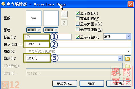 5. 右鍵點擊第一個次級按鈕,選擇“編輯”,如圖12,在彈出的“命令編輯器”中修改標簽為“C:”(①),修改提示信息為“Goto C:/”(②)(這里的提示信息可以隨便修改,比如你可以改為“切換到C盤根目錄”,以下相同)。在下面的“函數”位置輸入“Go C:/”(③)(這個命令是唯一的,也就是必須是這條命令),確定退出。