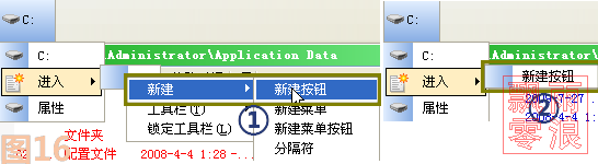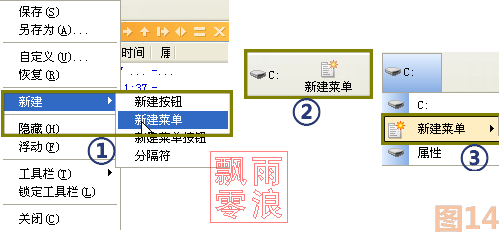 7. 右鍵點擊這個新建Toolbar(也就是當前操作的按鈕所在的Toolbar,即剛才新建的名稱為Driver_Ex的Toolbar)的空白地方,選擇“新建-新建菜單”(①),如圖14,Toolbar上會出現一個“新建菜單”的按鈕(②)。左鍵點住這個菜單按鈕,把它拖到C:按鈕的次級按鈕的中間位置(③)。