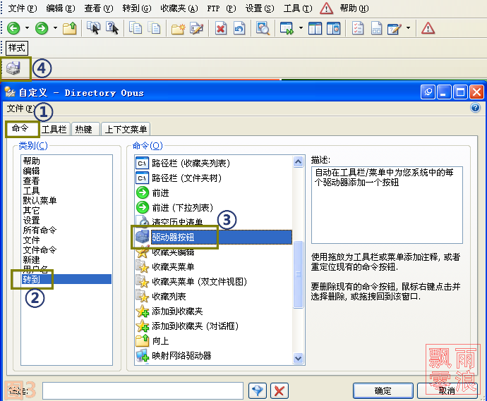 3. 如圖3,點擊“命令”標簽(①),在下方的列表框中選擇“轉到”(②),再在右邊的列表框中選擇“驅動器按鈕”(③),然后在驅動器按鈕上按住左鍵,把“驅動器按鈕”拖到上一步剛建立的空白Toolbar上(④)。此時Toolbar上出現了一個軟盤、光盤、硬盤三合一模樣的圖標,點擊確定退出。