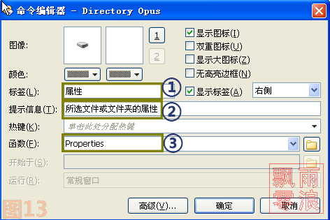 6. 右鍵點擊第二個次級按鈕,選擇“編輯”,如圖13,在彈出的“命令編輯器”中修改標簽為“屬性”(①),修改提示信息為“所選文件或文件夾的屬性”(②)。在下面的“函數”位置輸入“Properties”(③)(這個命令的作用是顯示文件的屬性對話框,這里只是用這條命令舉例子,如果你熟悉Directory Opus的內部命令,可以修改為自己需要的),確定退出。