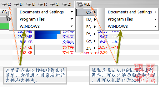 鼠標右鍵點擊“C:”按鈕后,會彈出C盤下所有文件及文件夾(不能顯示隱藏文件和文件夾),鼠標在某個目錄按鈕上懸停后會自動彈出下級目錄,在這里你可以直接進入目錄并打開此目錄下的文件。但是有一個弊端,不能打開文件夾!下面我們再來打造一個能打開文件夾的DriverBar。