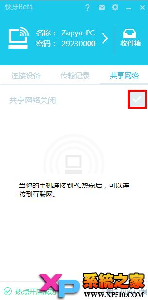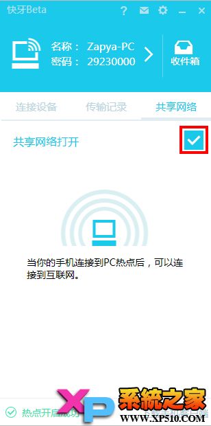 啟動“快牙電腦版”后,如果電腦已連接互聯網,則“快牙電腦版”將自動分享WiFi信號,供其他設備連接上網,此功能也可手動關閉網絡共享。
