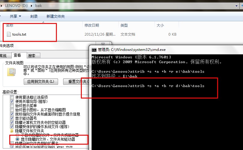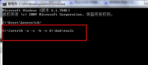 2.鍵入:attrib +s +a +h +r e:/bak/tools