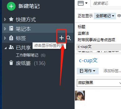 4、點(diǎn)擊左側(cè)的新建筆記按鈕,然后筆記編輯處,添加標(biāo)簽?zāi)夸洝<纯蓪⒐P記放在此標(biāo)簽下。