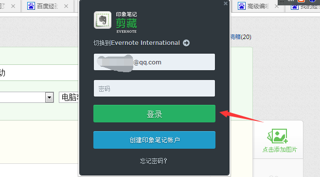 3、安裝好插件之后打開瀏覽器,點(diǎn)擊瀏覽器菜單欄里面的印象筆記按鈕圖標(biāo),先登錄你的賬號(hào),沒有賬號(hào)的可以注冊(cè)一個(gè)。