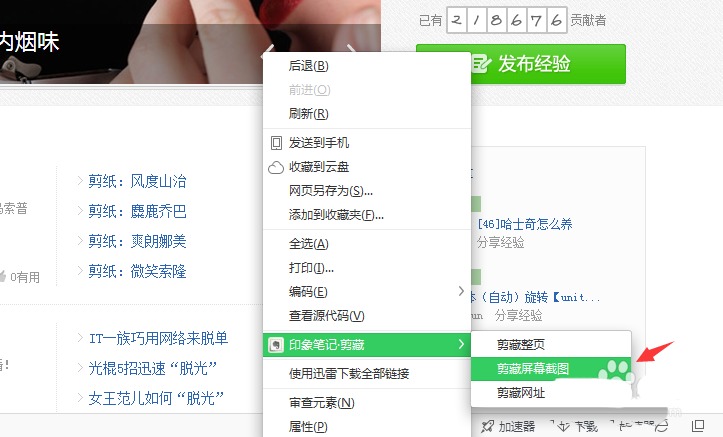 4、登錄賬號(hào)之后,在你需要剪藏的頁面,右擊會(huì)跳出一個(gè)菜單欄,看到印象筆記剪藏選項(xiàng),第一個(gè)我們先介紹剪藏整頁,剪藏整頁會(huì)把一整個(gè)網(wǎng)頁包括下拉進(jìn)行全剪藏,同步至你的印象筆記。